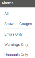 Click to open a list of all sensors that show the Down, Down (Partial), Down (Acknowledged), Warning, or Unusual status. Hover over Alarms to show other options.