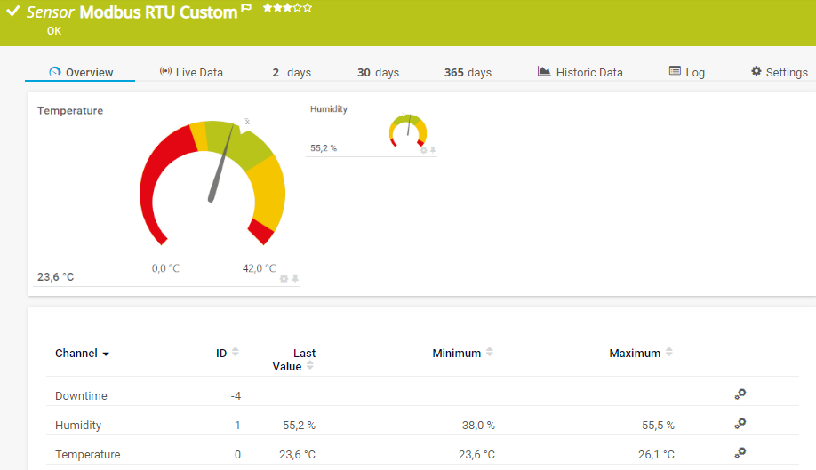 In the channel table on the Overview tab, this channel never shows any values. PRTG uses this channel in graphs and reports to show the amount of time in which the sensor was in the Down status.